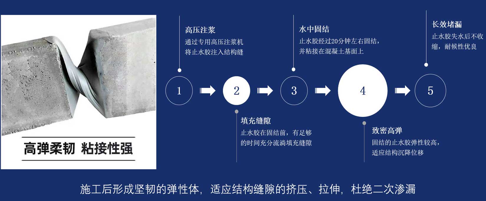 弹性注浆止水胶,主要用于盾构管片、变形缝(含沉降缝)等渗漏注浆堵漏,以及因混凝土裂缝、蜂窝等质量缺陷导致的渗漏,标本兼治。弹性注浆止水胶注浆充填饱满密实,充满整个质量缺陷,挤出积水快速凝固堵住渗漏,包裹钢筋避免钢筋水泡锈蚀,潮湿面粘结力强牢牢粘住缺陷周边混凝土。